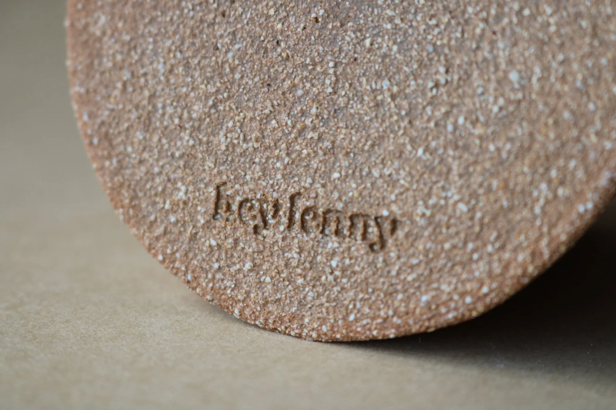Detail image of a handmade ceramic plant pot with the Hey Lenny logo.